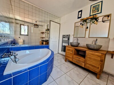 Au 1er étage un couloir desservant 2 chambres avec placard et accès au solarium côté Sud (Canigou) et une salle de bain avec wc.