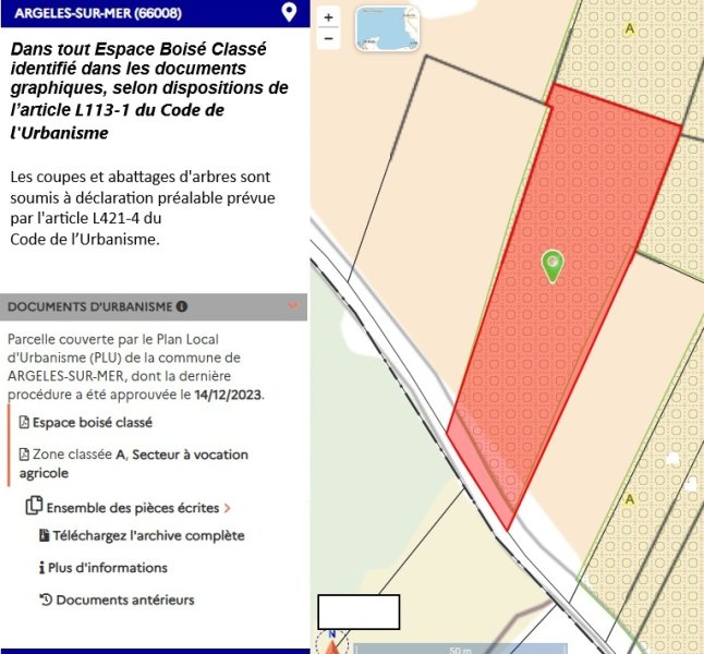 Nous vous proposons à la vente une parcelle de terre en zone Agricole. Terrain arboré plat non clôturé. Accessibilité direct de la traverse En Zone A, il fait parti d'un espace boisé classé.